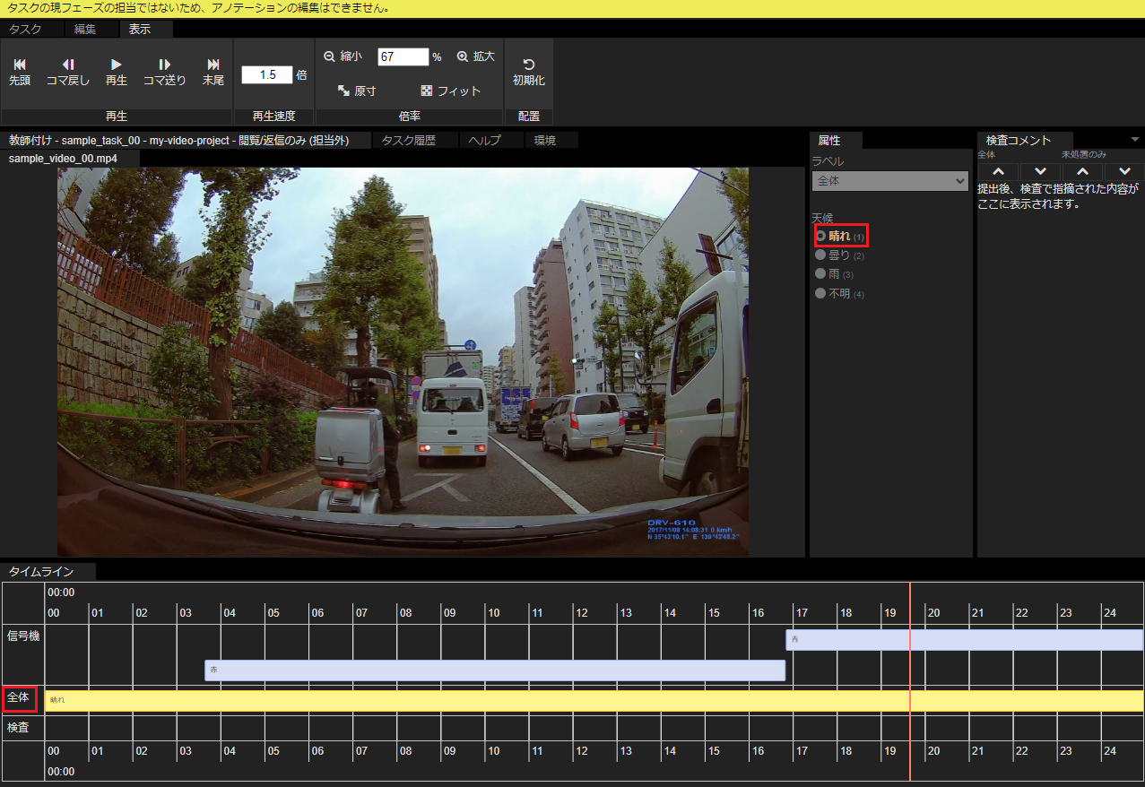 「全体」のアノテーションは、区間に付けるものではなく動画全体に属性を付与するためのアノテーションです。ここでは動画全体に対して「晴れ」の属性が付与されています。